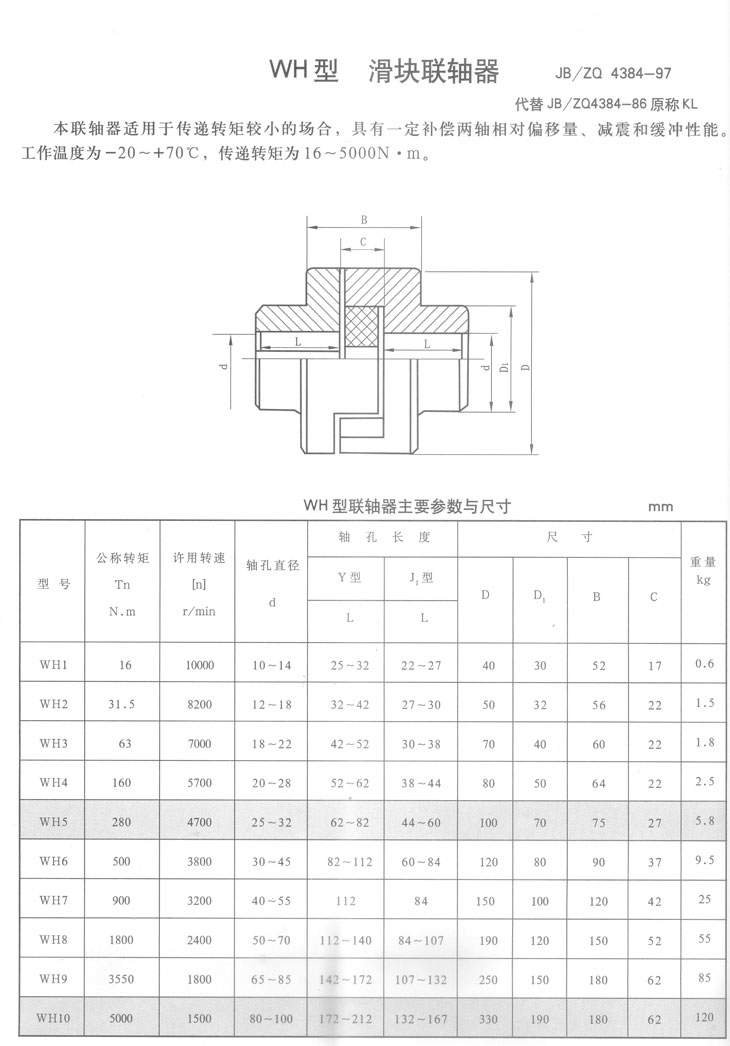 WH滑塊聯(lián)軸器的特點(diǎn) 滑塊聯(lián)軸器與十字滑塊聯(lián)軸器結(jié)構(gòu)相似,不同之處在于中間十字滑塊為方形滑塊,利用中間滑塊在其兩側(cè)半聯(lián)軸器端面的相應(yīng)徑向槽內(nèi)滑動(dòng),以實(shí)現(xiàn)兩半聯(lián)軸器聯(lián)接。 該聯(lián)軸器噪聲大,效率低,磨損快,一般盡量不選用,只有轉(zhuǎn)速很低的場合,如球磨機(jī)等才選用。 許用補(bǔ)償量:軸向△ x=1~2mm , 徑向△ y ≤ 0.2mm ,角向△α≤ 40 ′。