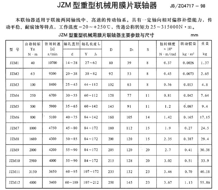 ●JZMJ型重型機(jī)械用膜片聯(lián)軸器具有機(jī)械強(qiáng)度高、承載能力大、質(zhì)量輕、結(jié)構(gòu)尺寸小,傳動(dòng)效率和傳動(dòng)精度高、可靠性好、裝拆方便,且具有無(wú)相對(duì)滑動(dòng),不需潤(rùn)滑,使用壽命長(zhǎng)、無(wú)噪聲、耐酸、堿、防腐蝕等特點(diǎn),可用于高溫、低溫和有油、有水和腐蝕介質(zhì)的工況環(huán)境。適用于中、高速、大轉(zhuǎn)矩軸系傳動(dòng)。以及各種機(jī)械裝置載荷變化不大的軸系傳動(dòng),通用性極強(qiáng)。
